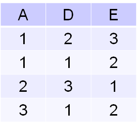 Soient r et s deux relations sur R, r et s n'ont pas forcément le même schéma de relation. Disons par exemple que schéma(r)={A,B,C} tandis que schéma(s)={A,D,E}. r X s aura comme schéma de relation {r.1,r.B,r.C,s.A,s.D,s.E}