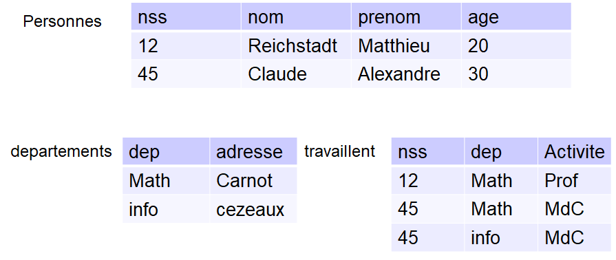 Voilà deux exemples avec nos 3 tables personnes, travaillent, departement.