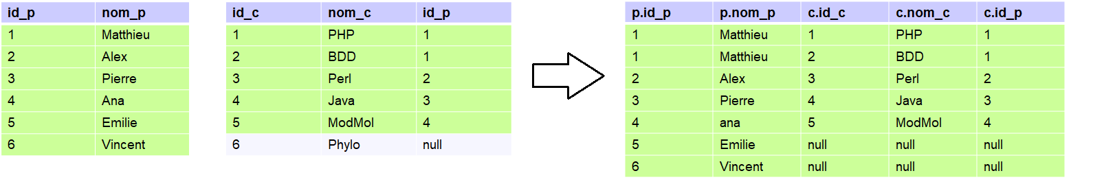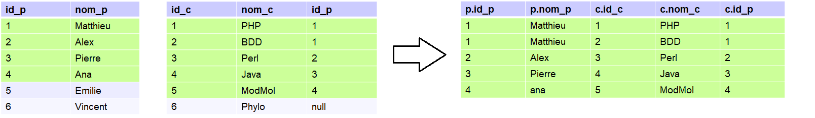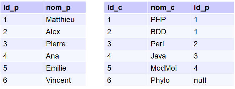 Ici, seuls les éléments des deux tables pouvant être conservés dans le résultat final sont gardés. Ainsi ni les profs 5 et 6 ne donnant pas de cours, ni le cours 6 ne seront représentés dans le résultat de la jointure.