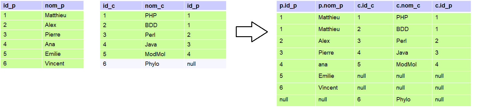 mysql> select * from prof left join cours on prof.id_p = cours.id_p;