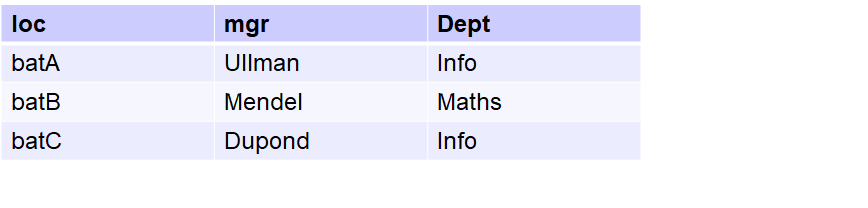 Projection des attributs 1 et 3 de la relation departements où mgr="Ullman"